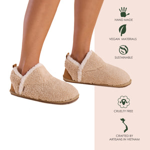 Our Aurora Booties are designed in partnership with the Cham Pa weaving co-op. These cozy handmade slippers feature allover soft faux sherpa. The fabric is sourced using direct trade principles in the weaving community of Phan Rang, Vietnam.