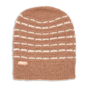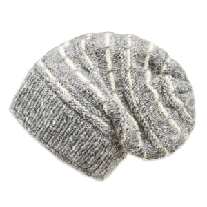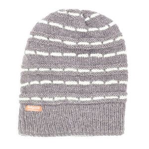 The Telluride slouchy cap brings effortless style to cold weather. With its relaxed, easygoing shape and soft striped texture, this hat offers a modern take on classic knitwear. Designed to sit comfortably with a gentle slouch at the back, it’s the perfect mix of cozy and cool. Each cap is handknit by women-led artisan groups in Nepal using heathered wool and lined with fleece for added warmth.